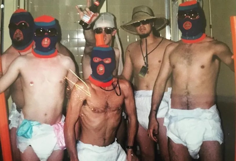 Lo gracioso esta foto del año 1996 es que muestra a sus miembros originales cubriendo sus rostros con un pasamontañas (algunos usando además lentes oscuros) y vistiendo solamente unos pañales, pasándolo a todo dar como podrán observar, quitados de la pena porque, ya ven, algunos del equipo y de la propia banda pensaron que sería buena idea: