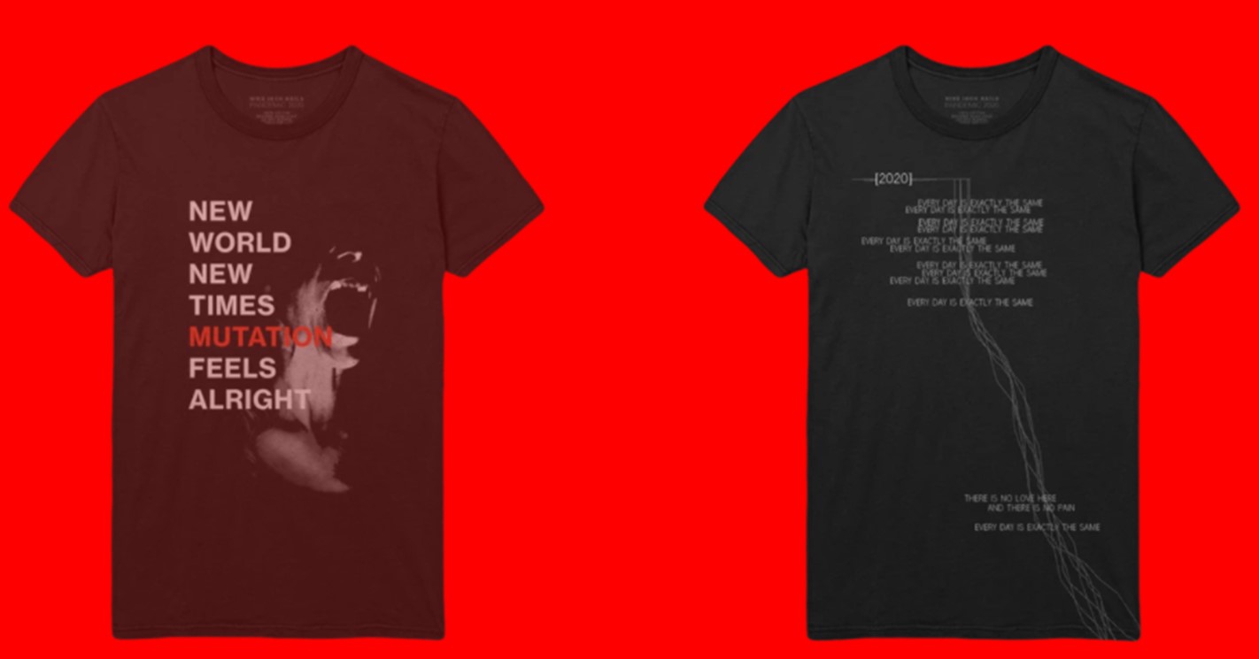 La línea se llama Pandemic 2020. Y en las tishas encontraremos títulos y letras de diversas canciones de la banda, que abordan de alguna manera directa o indirecta este "extraño" momento que vivimos como humanidad en la historia. Digamos que es algo así como si NIN se hubiera anticipado años antes a este escenario.