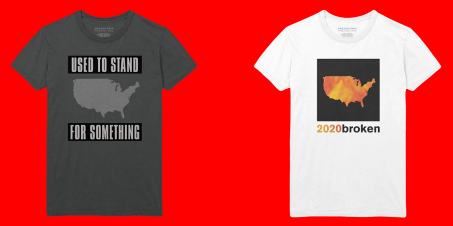 Las rolas elegidas para diseñar las camisetas son "Shit Mirror" del disco Bad Witch de 2018, y "Everyday is Exactly the Same" del LP With Teeth de 2005. Otras tienen impresos mapas de Estados Unidos con líneas de la canción "Capital G del EP Broken del año 1992; y otras más tiene el título de "We’re in This Together".