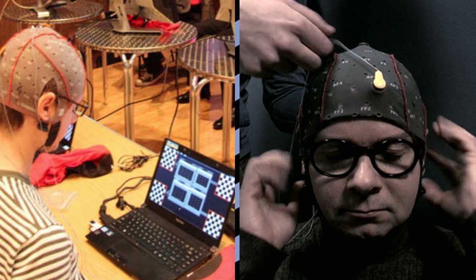 Nuestro cerebro produce electricidad todo el tiempo. Las señales puede ser débiles pero podemos amplificarlas y analizarlas. Entonces tenemos, por ejemplo, dos iconos en la pantalla: uno parpadea a 10 hertz y el otro a 15 hertz. Si nos fijamos en el de quince, podemos detectarlo… podemos detectar hasta ocho frecuencias en ese instante.